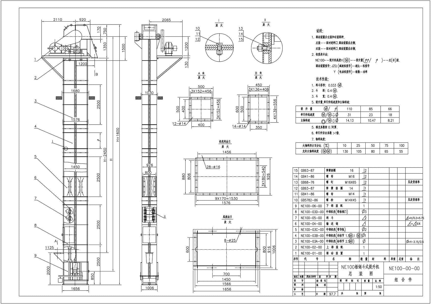 [NE100斗式提升機總裝圖]  [NE100斗式提升機外形尺寸]  [NE100斗式提升機總裝圖地基圖]